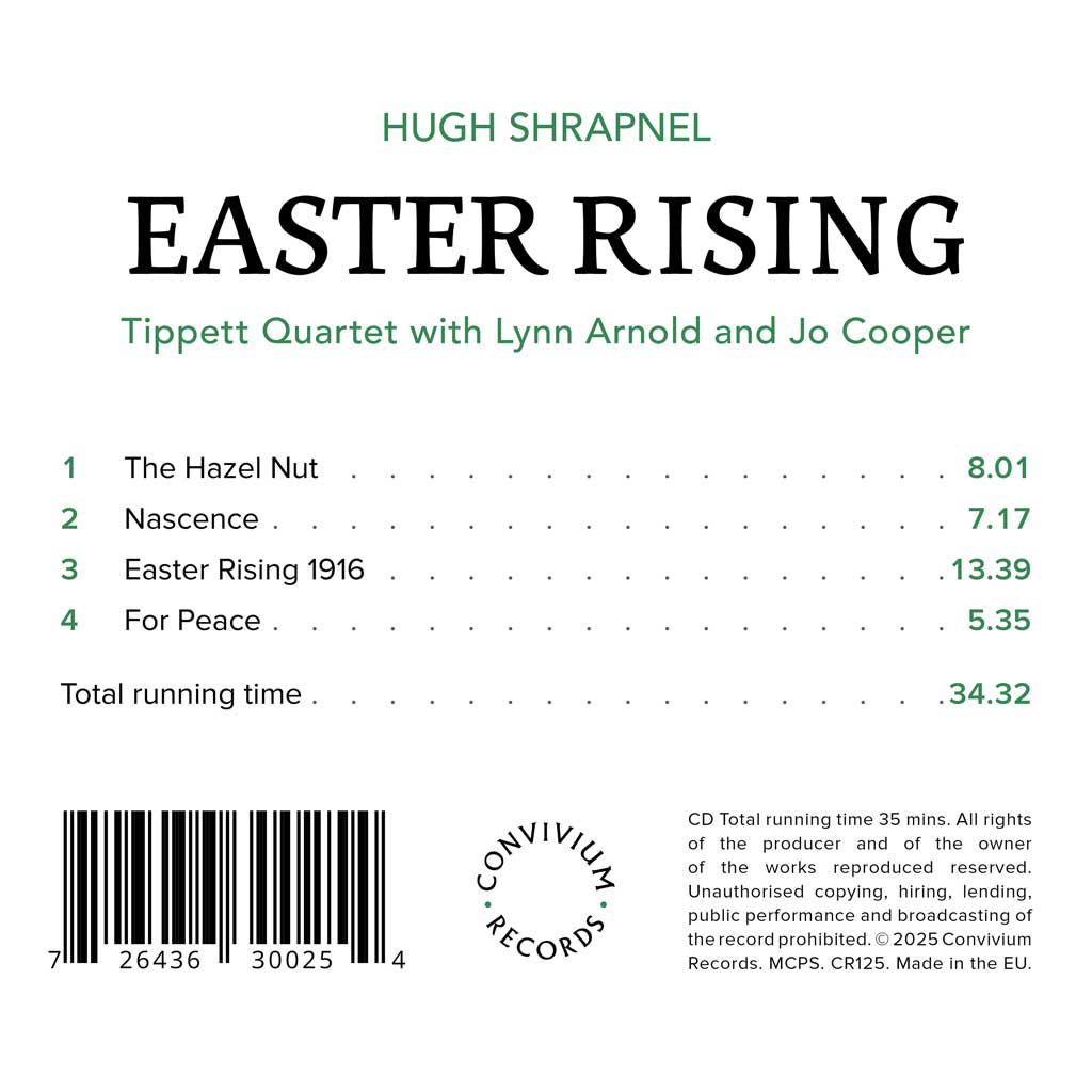 This collection of string music by Hugh Shrapnel is a powerful, humane response to poetry, history and social unrest. From the poetry-inspired lyricism of The Hazel Nut, through the turbulent, searching drama of Nascence, to the powerful narrative of Easter Rising, these works explore struggle, awakening and the possibility of peace.