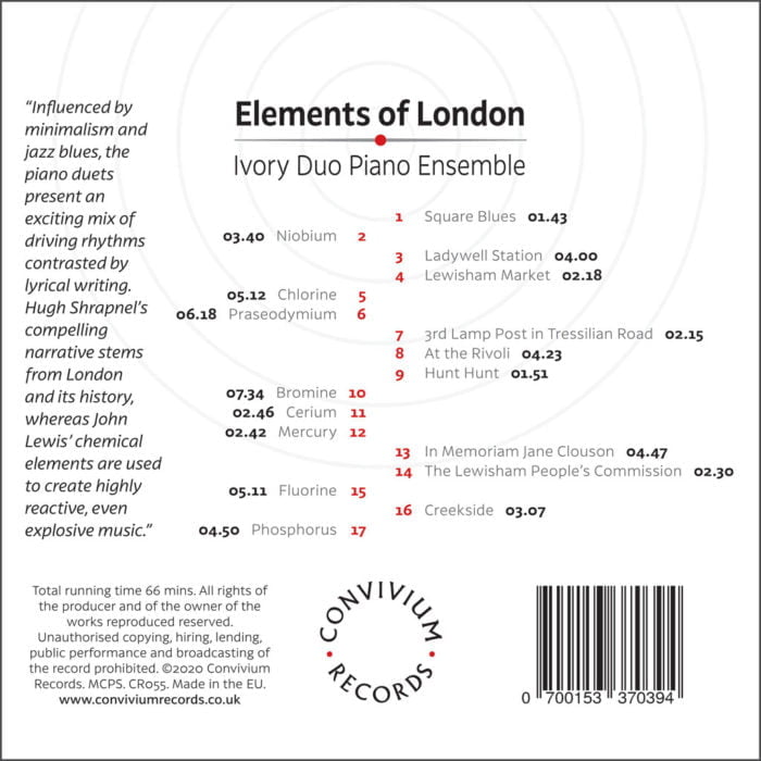 Influenced by minimalism and jazz blues, the piano duets present an exciting mix of driving rhythms contrasted by lyrical writing. Hugh Shrapnel’s compelling narrative stems from London and its history, whereas John Lewis’ chemical elements are used to create highly reactive, even explosive music.