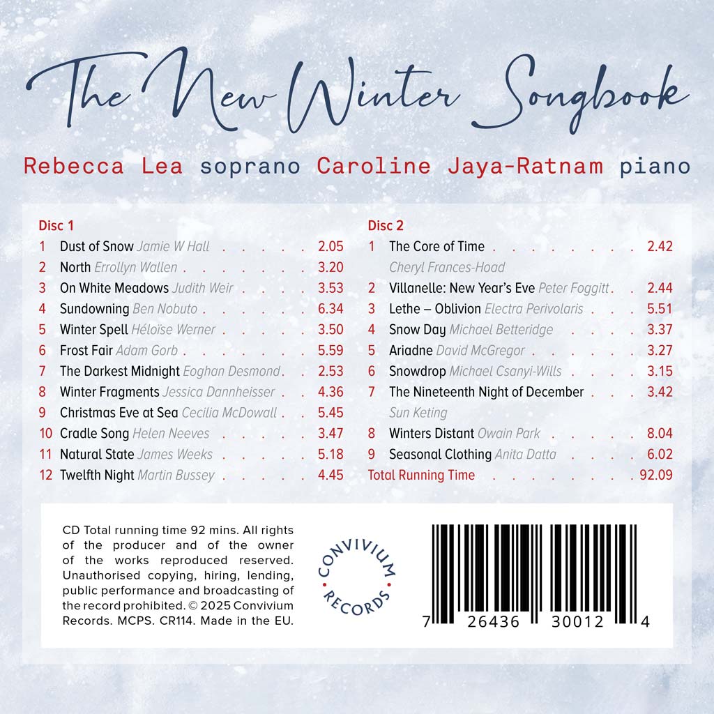 Discover this collection of twenty-one songs reflecting contemporary experiences of, and attitudes towards, the winter season, performed by soprano Rebecca Lea and pianist Caroline Jaya-Ratnam.